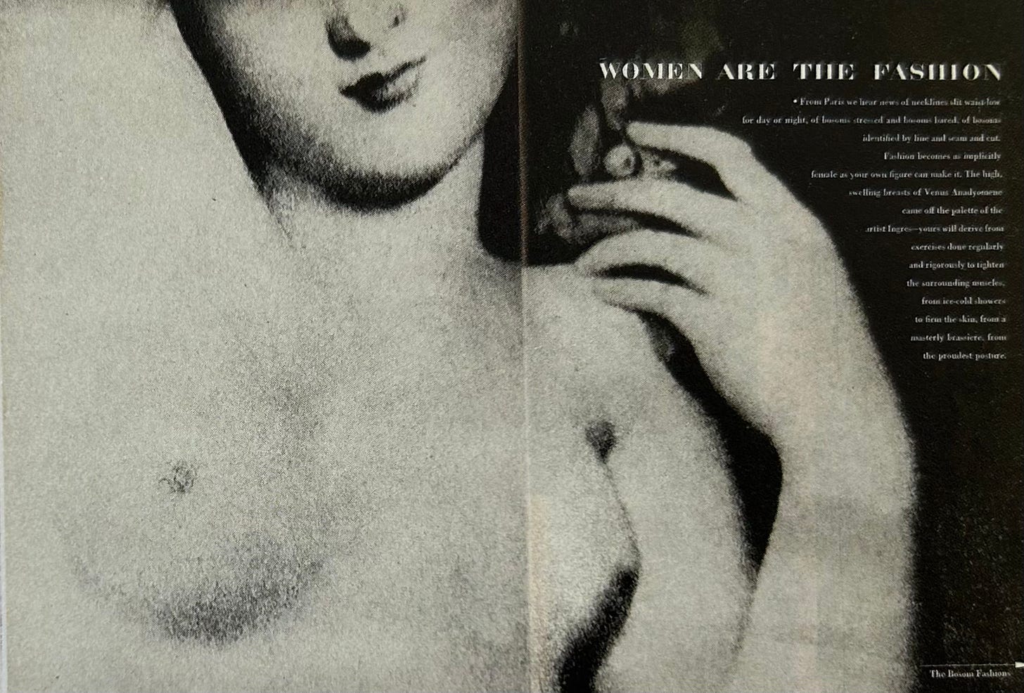 From Paris we hear news of necklines slit waist-low for day or night, of bosoms stressed and bosoms bared, of bosoms identified by line and seam and cut. Fashion becomes as implicitly female as your own figure can make it. The high, swelling breasts of Venus Anadyomene came off the palette of the artist Ingres—yours will derive from exercises done regularly and rigorously to tighten the surrounding muscles, from ice-cold showers to firm the skin, from a masterly brassiere, from the proudest posture.