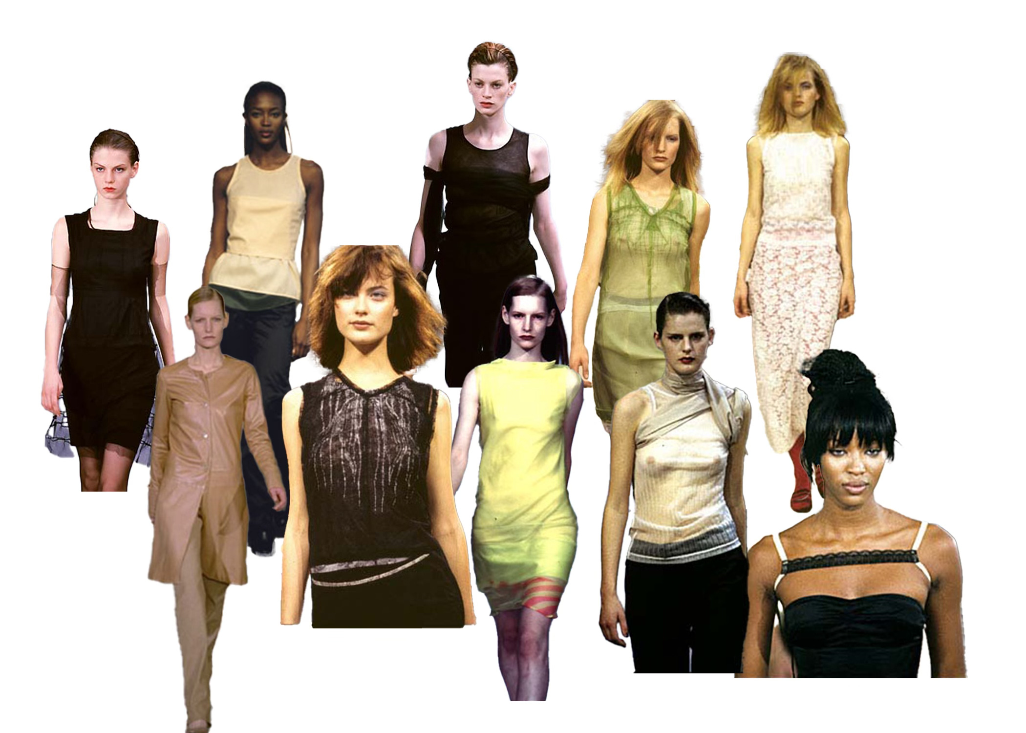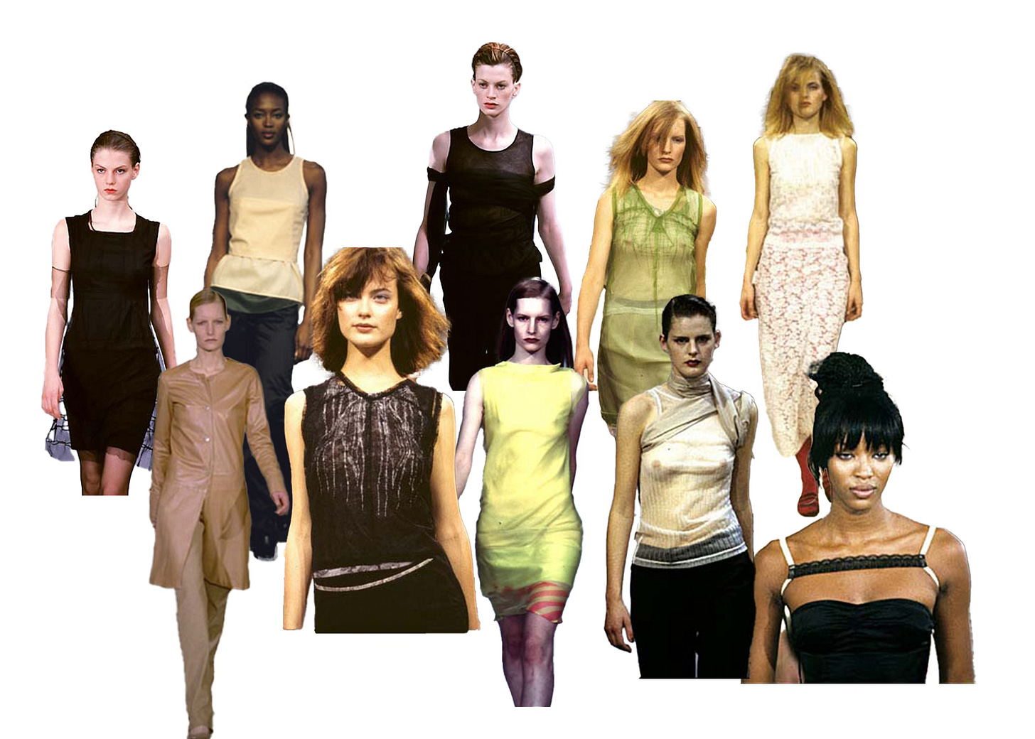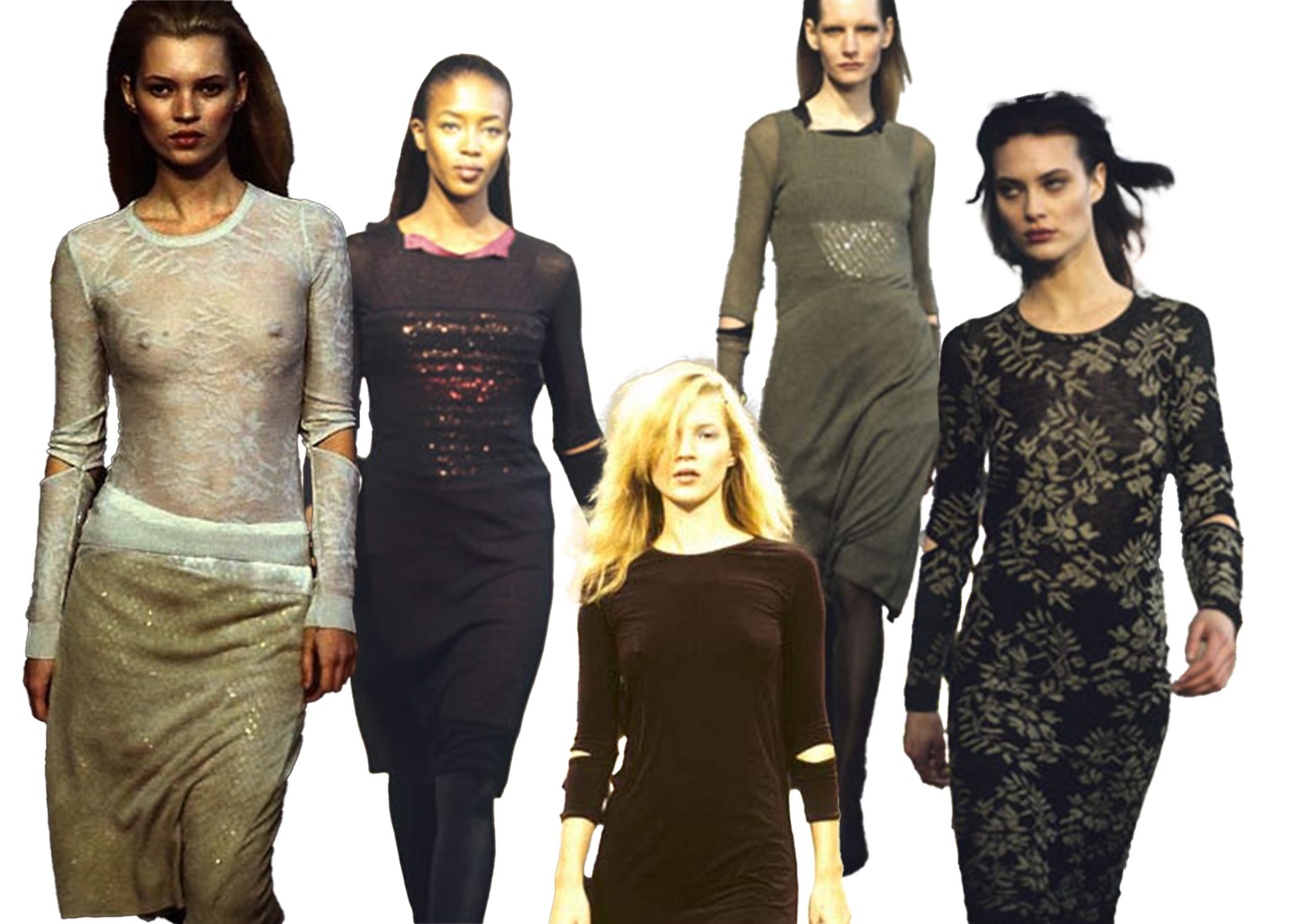 Alternately referred to as the “New Glamour” and “counter-couture,” his aesthetic during this era was defined by subtle sex appeal and club wear-inspired subversion, unconventional fabrics, and an effortless simplicity. It was also defined by specific design details that force the wearer to stand up a little straighter. These include fabric and gauzy sashes wrapped around the neck, chest, or bodice like an elegant, bondage-y harness and, most typically, a marriage of slim-cut sleeves, narrow shoulders, and extra-high armholes.